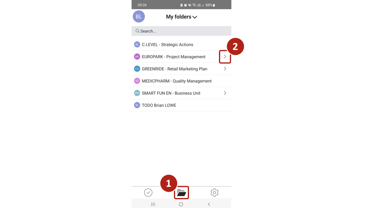From the “My folders” menu you can choose the action plan you want to display using the drop-down menu that appears when you click on the arrow to the right of the action plan name.