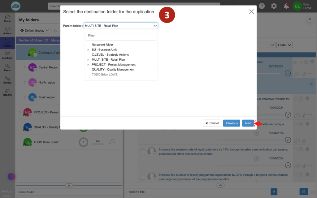 La popin suivant vous demande à quel endroit de l’arborescense de vos dossiers vous souhaitez voir la duplication apparaitre. Sélectionnez un dossier pour voir votre duplication se rattacher à celui-ci, ou rien pour que votre duplication se positionne directement à la racine de vos dossiers