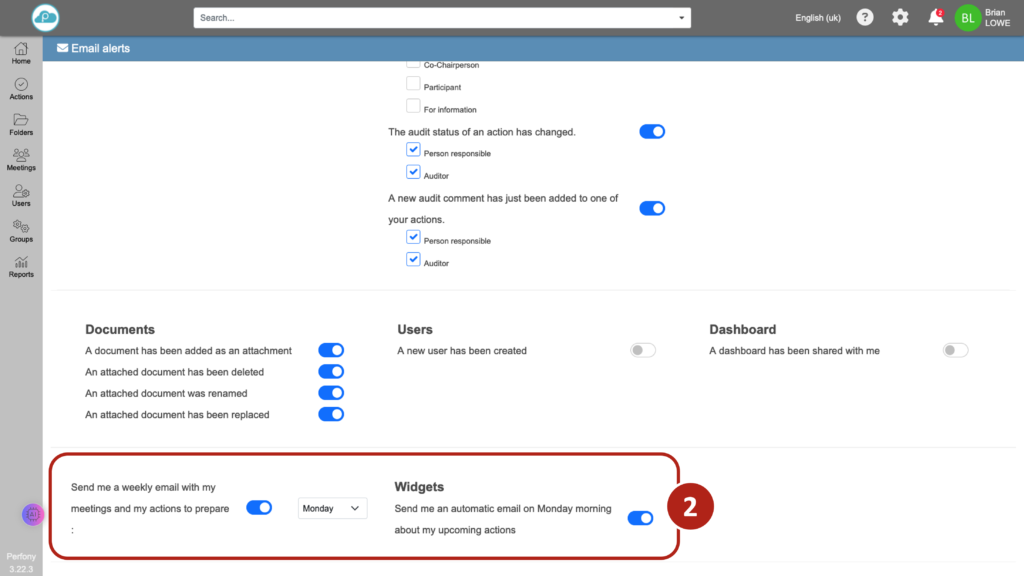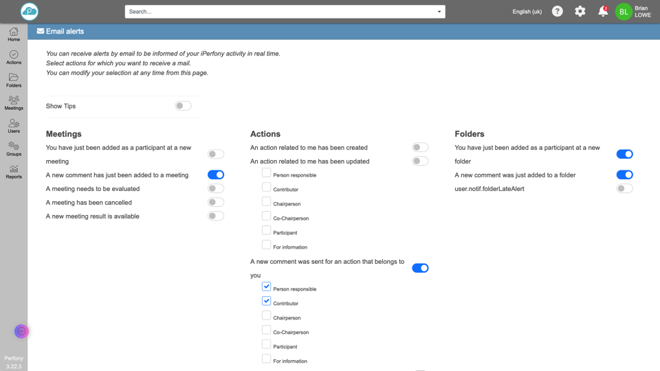 Sur cette page vous pourrez activer à tout moment les différents envoi d’email d’alerte : nouvelle action, nouvelle réunion.