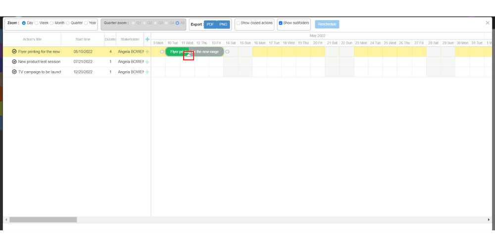 Vanuit de Gantt-view kunt u de voortgang van een actie bijwerken.