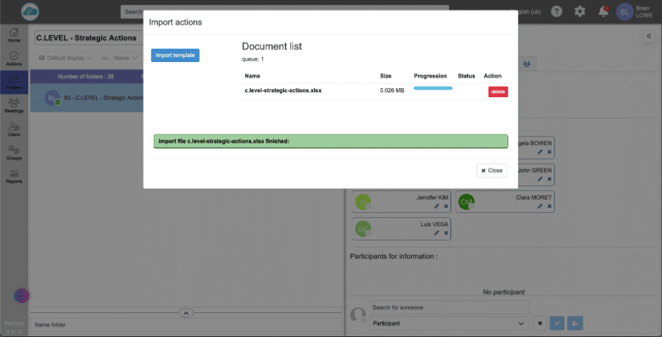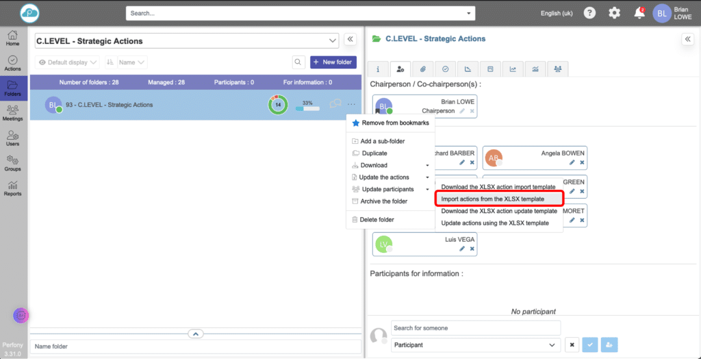 Das Ziel dieser Funktion ist es, Ihnen Zeit zu sparen, indem Sie massiv Aktionen aus einer .xls-Datei in Perfony-Ordner importieren. Klicken Sie dazu einfach auf die „…“ am Ende der Zeile eines Ordners und wählen Sie den Menüpunkt „Aktionen aktualisieren“.