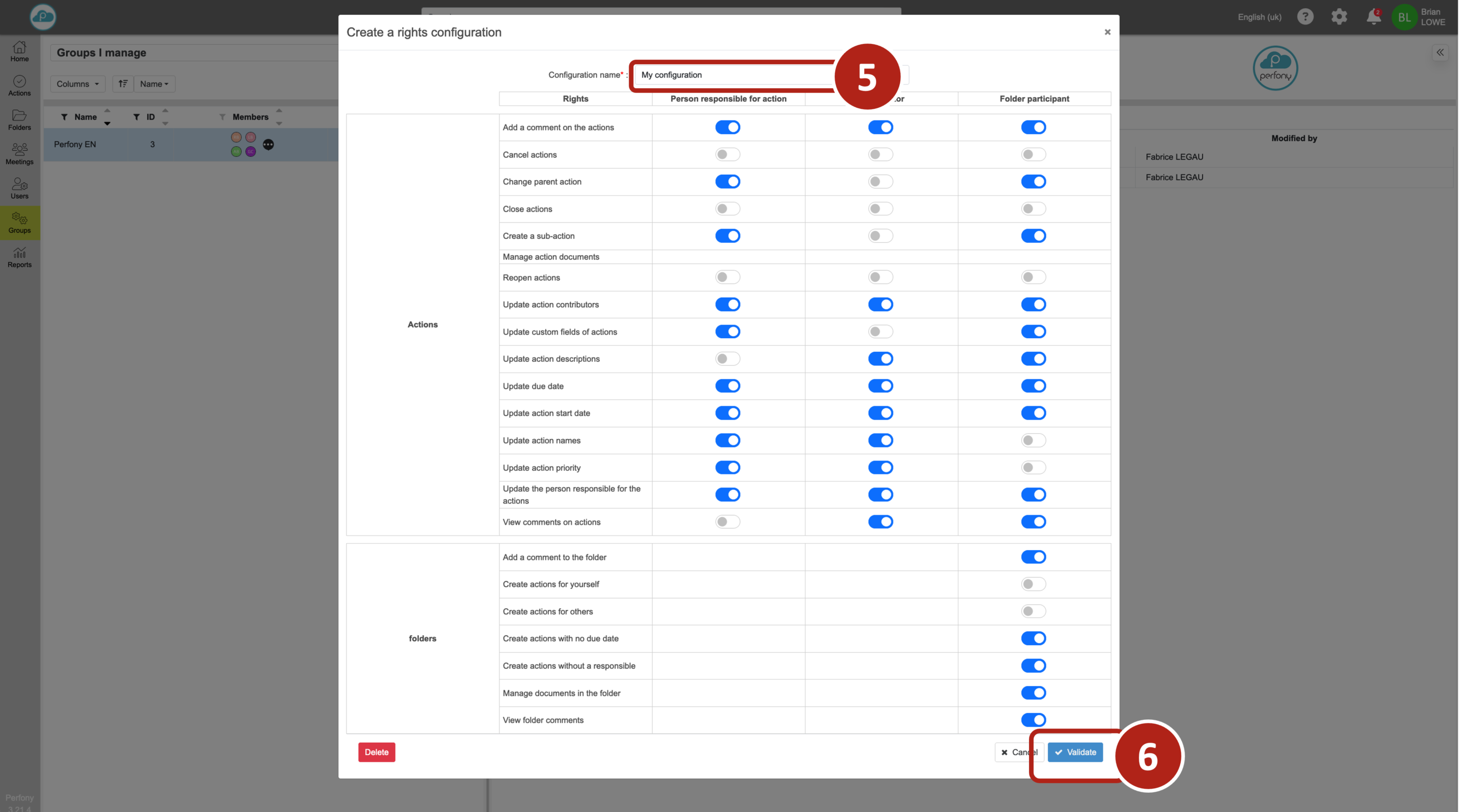 You can change your rights configuration at any time. To do this, click on the “rights on actions” tab , select your configuration from the list , and the settings window will open.