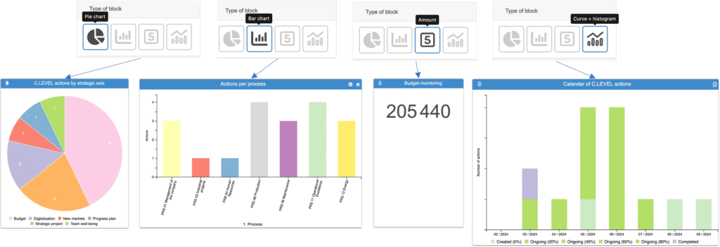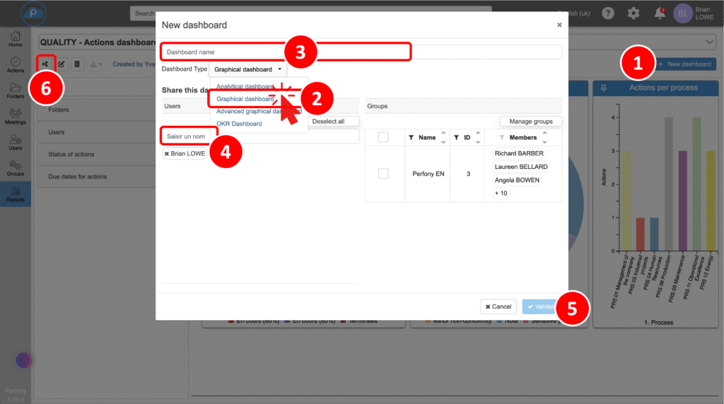 Una vez validado su cuadro de mandos, puede empezar a rellenarlo. La próxima vez que te conectes, accede a tu panel de control desde el menú «Informes» y el menú desplegable.