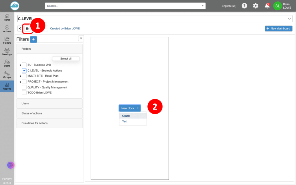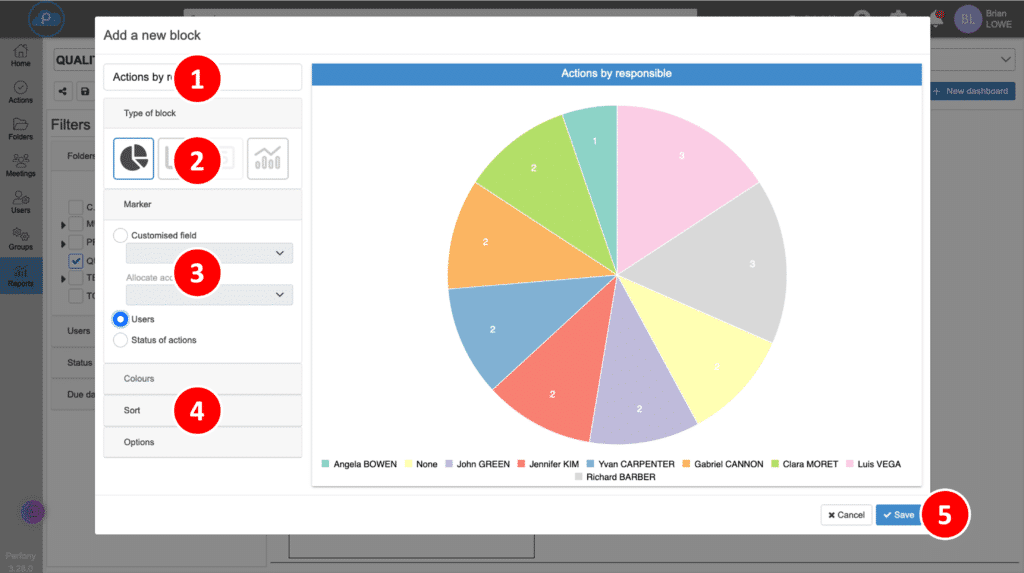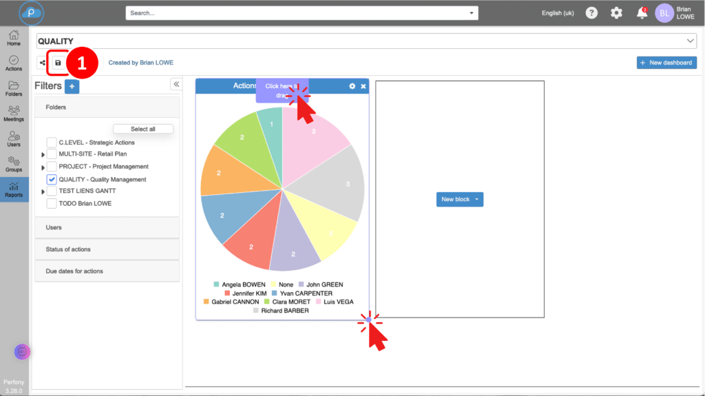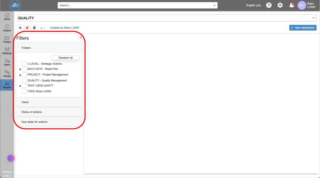 Selección de las fuentes de datos: Para empezar, seleccione las carpetas que se utilizarán como fuentes de datos para los gráficos. A continuación, puede afinar los gráficos utilizando filtros de usuario, que destacan las acciones de las que son responsables, así como el estado y la fecha prevista de finalización de las acciones, para obtener un cuadro de mandos actualizado.
