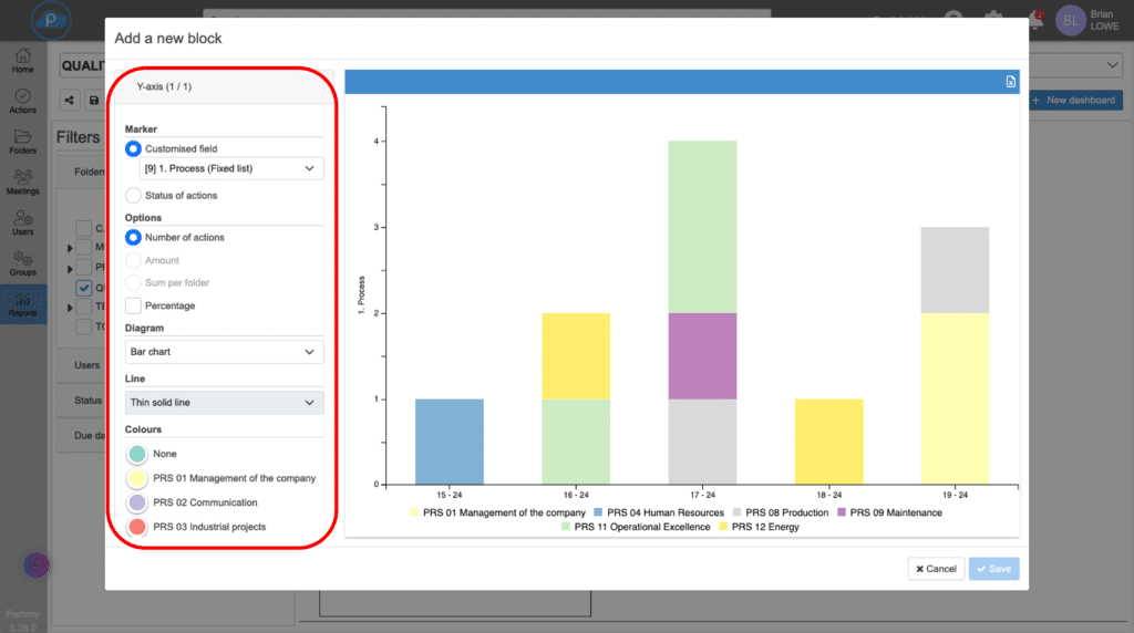 Seleccione un campo personalizado del menú desplegable para el eje y. Personaliza el tipo de diagrama, los colores y la leyenda.