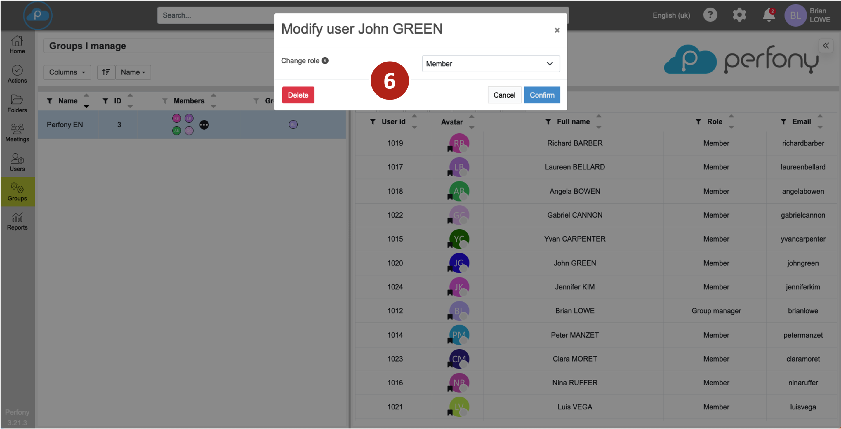 - Elimina al usuario del grupo (esto no elimina al usuario de Perfony, simplemente dejará de tener acceso a las plantillas de carpetas de este grupo).