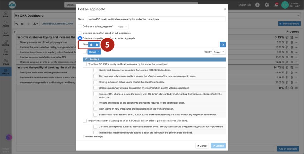 Si el agregado se calcula en función del progreso de las acciones, ahora podemos seleccionarlas. Se muestran todas las acciones de las carpetas a las que tenemos acceso. Puede elegir restringir la visualización filtrando las acciones según su nivel de bloqueo (comprenda la funcionalidad de bloqueo de acciones).