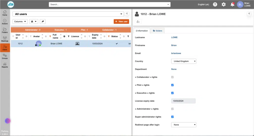 A continuación, los administradores pueden modificar los derechos de los usuarios desde el menú «Usuarios» para permitirles crear carpetas y reuniones (derechos «Pilot»).