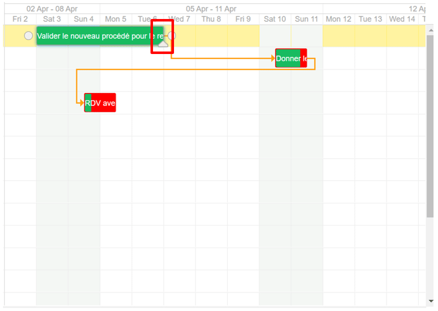 Cuando esté en la vista de Gantt, seleccione la acción sobre la que desea realizar los cambios en la ventana de la derecha, sitúe el cursor sobre el inicio o el final de la acción y arrástrelo para cambiar la duración de esta acción.