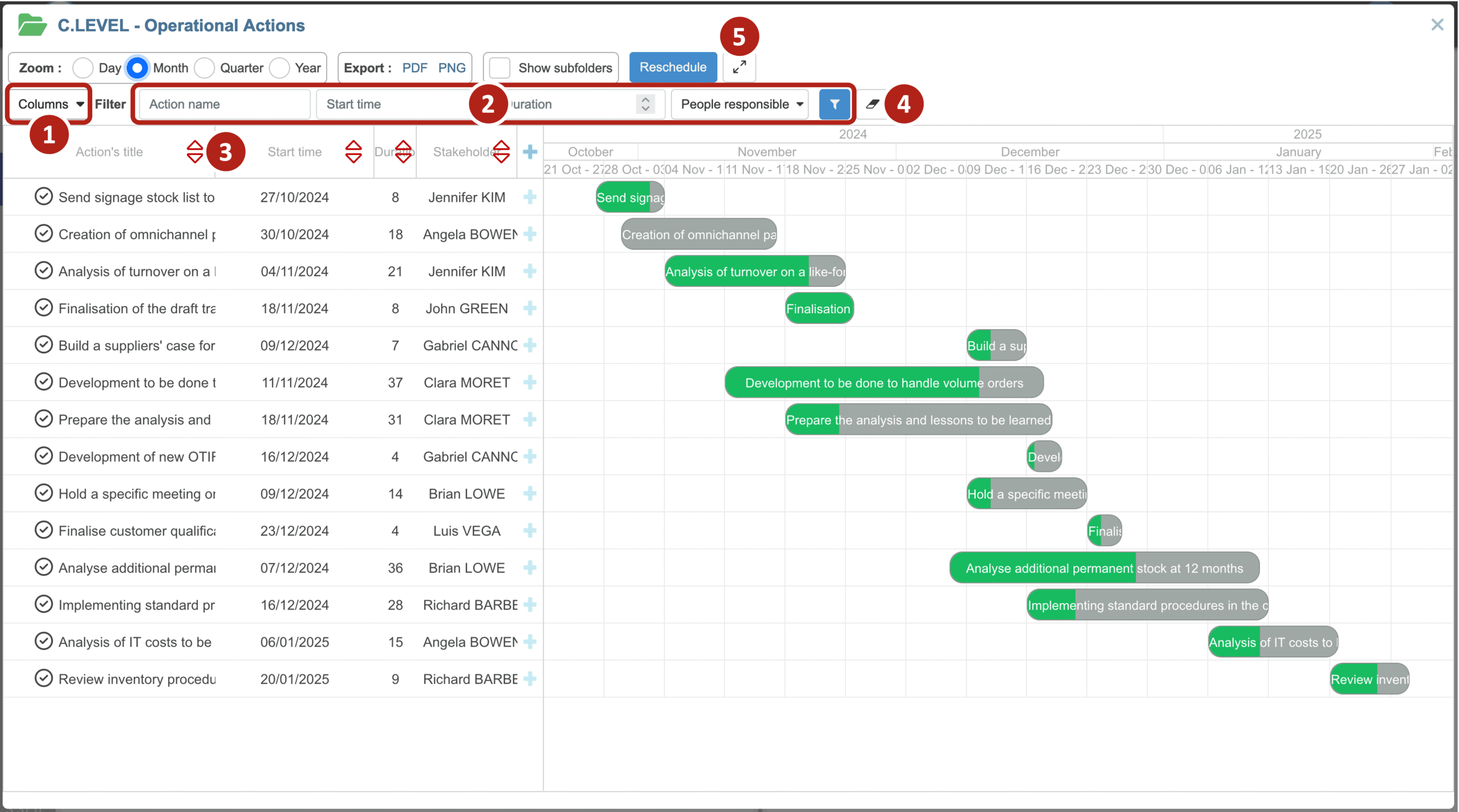 Consejo: no olvide hacer clic en el icono para eliminar los criterios de filtrado y empezar de nuevo con un Gantt que muestre todas las acciones de su proyecto.