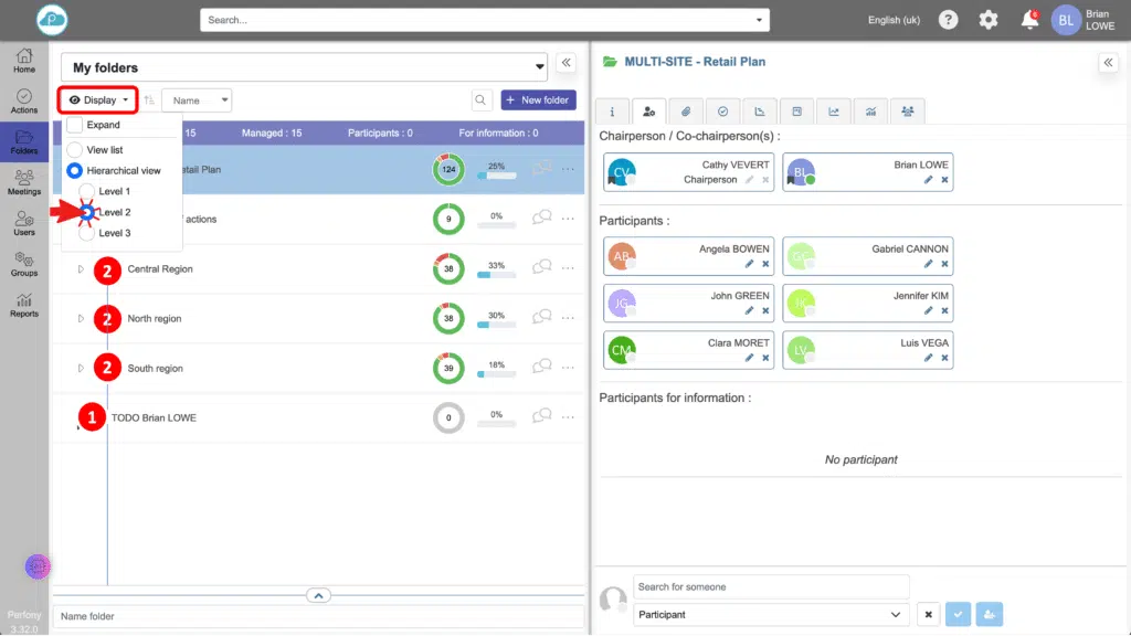 Ver según sus preferencias: si selecciona «Nivel 2», por ejemplo, sólo se verán y desplegarán las carpetas de los niveles 1 y 2. Sin embargo, aún tiene la opción de desplegar manualmente los niveles más profundos si es necesario.