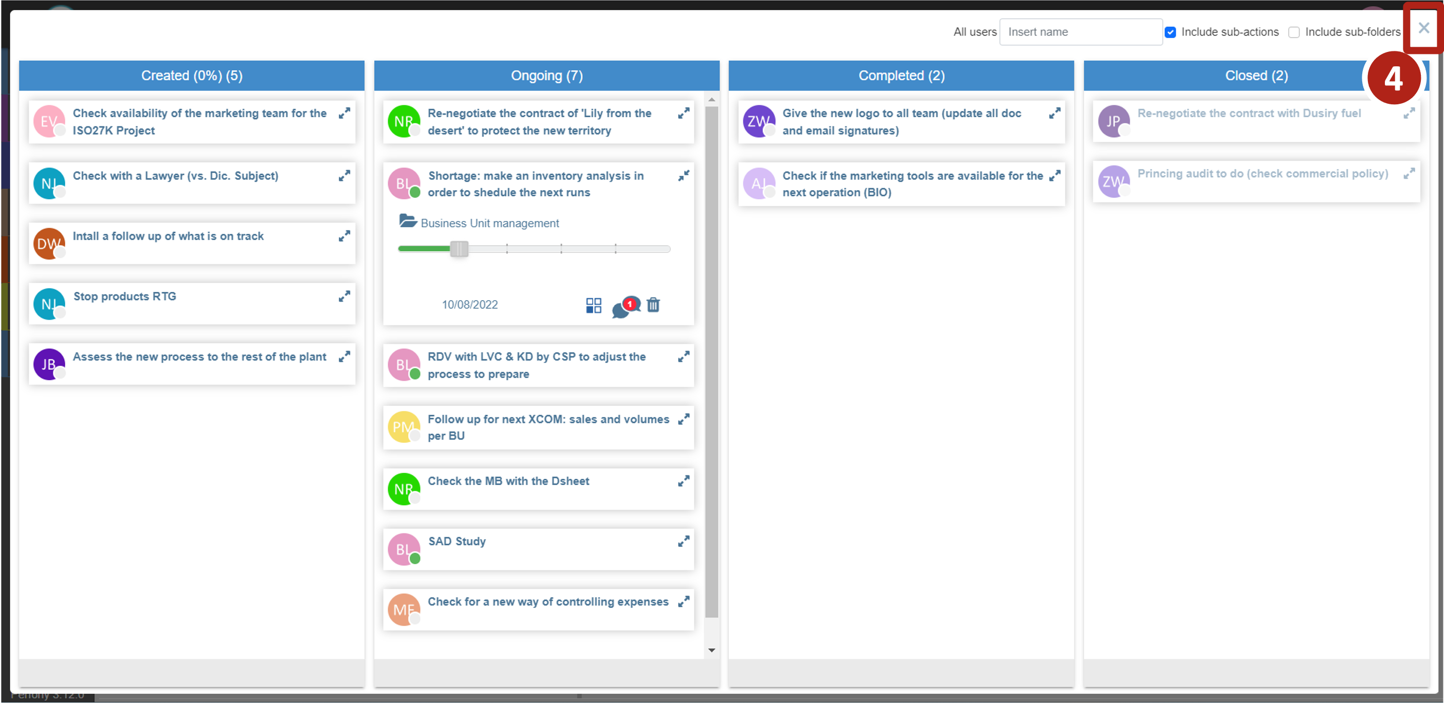 La vue étendue est accessible en cliquant sur le bouton et ouvrira le tableau de board Kanban dans toute la largeur de votre navigateur.