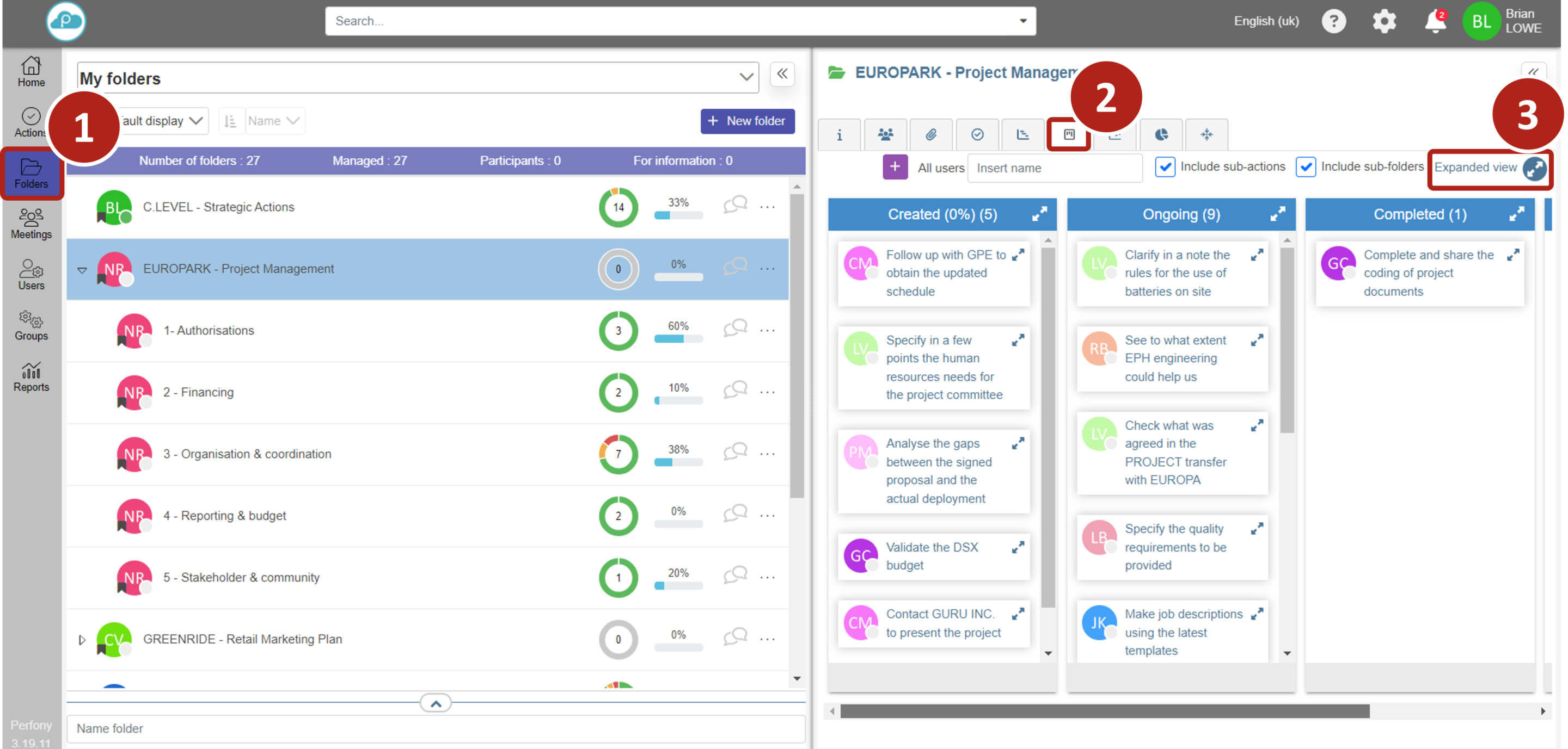 Pour accéder à la vue Kanban, rendez-vous dans le dossier qui vous intéresse en passant par l’onglet « dossier » du menu de gauche puis cliquez sur l’onglet « vue Kanban » permettant de changer la vue et sélectionnez la vue Kanban.