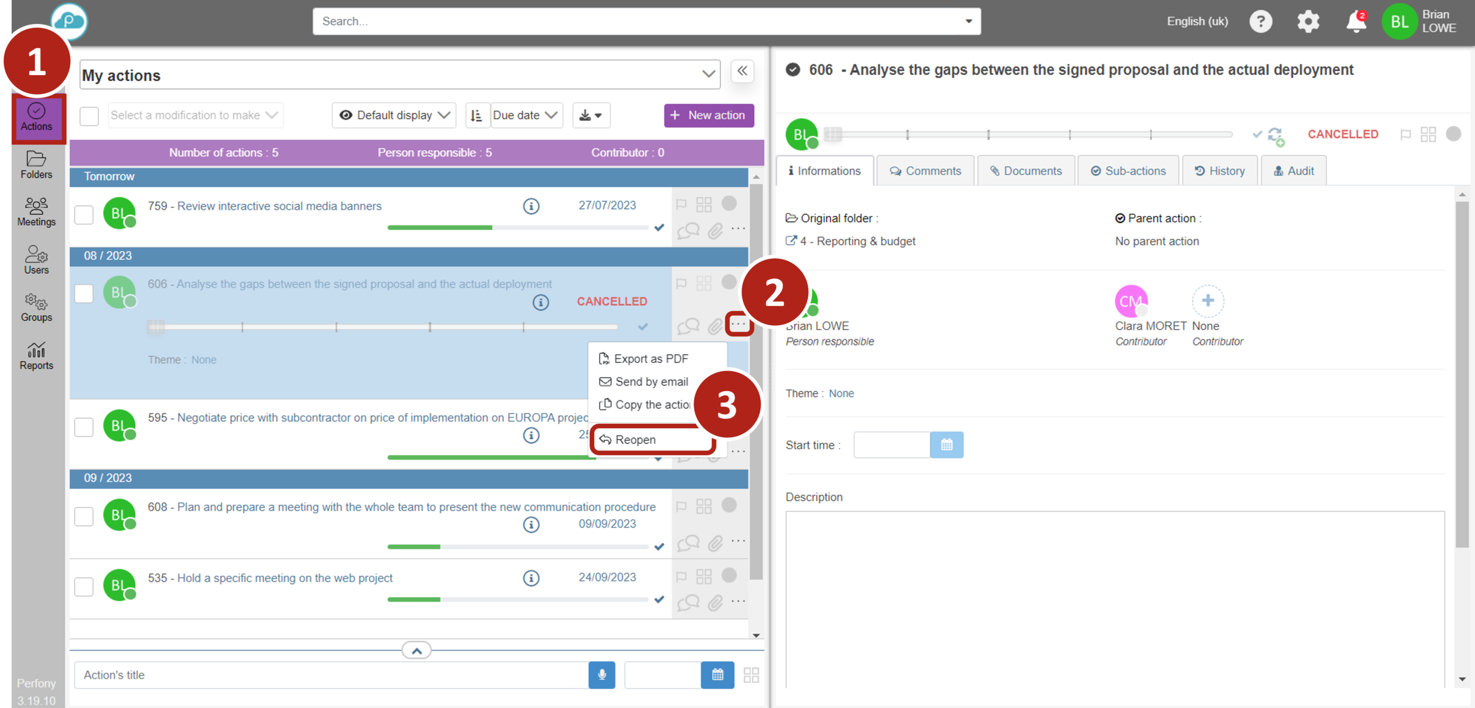Il est possible de rouvrir une action annulée, en cliquant sur « rouvrir ». Vous pourrez à nouveau réaliser toutes les opérations habituelles sur l’action.