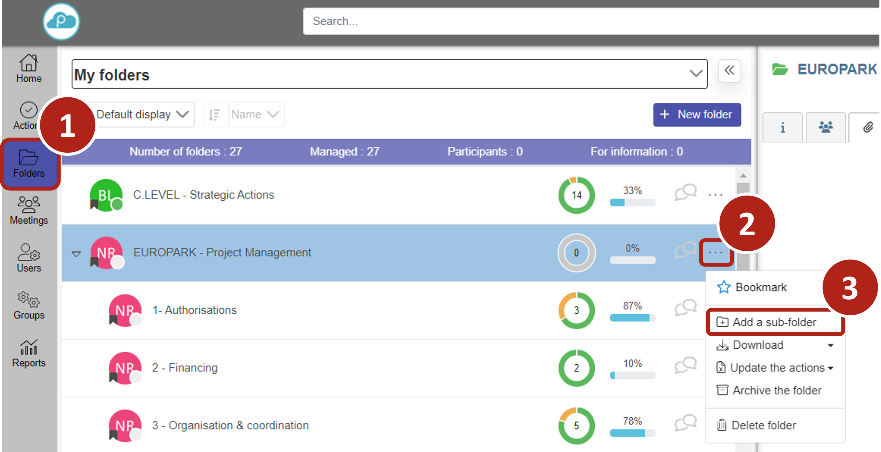 Les sous-dossiers se gèrent ensuite exactement comme des dossiers classiques : membres, commentaires, documents, sous-dossiers etc….