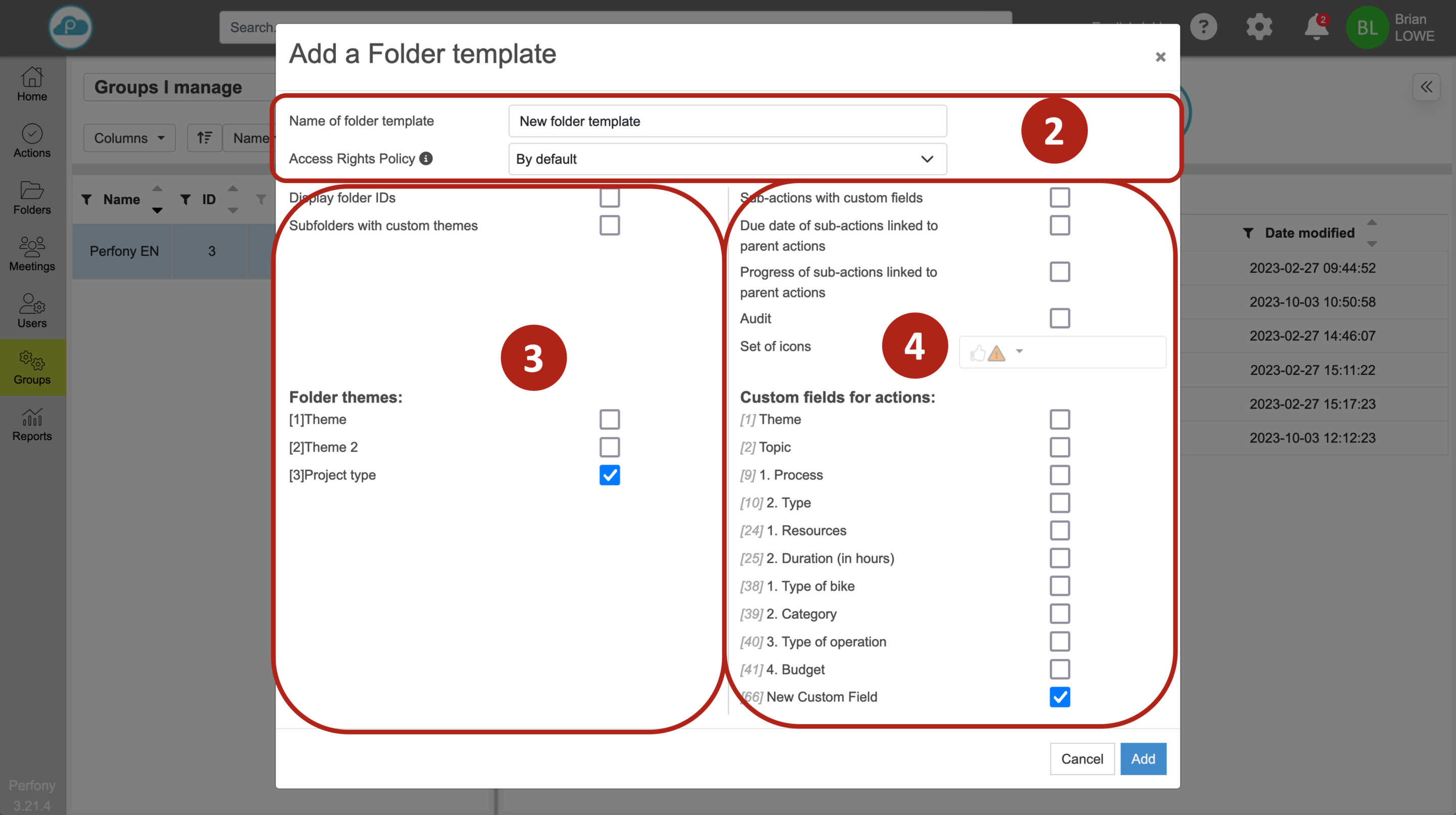 Une fois le modèle de dossier affiché et le rechargement de la page fait, le ou les thèmes de dossier apparaissent ainsi que le ou les champs personnalisés pour les actions .