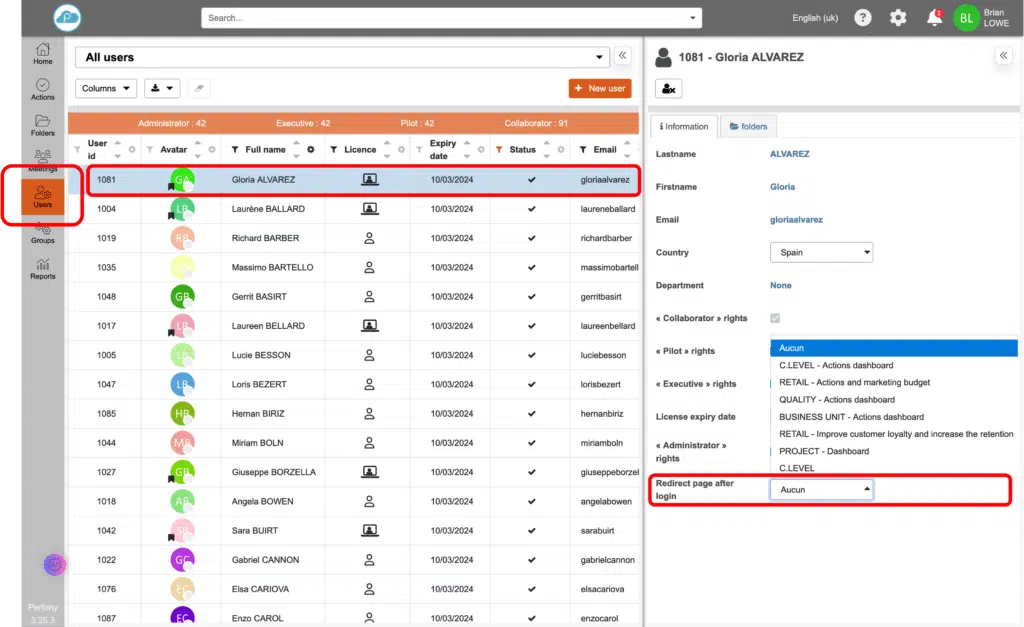 - En bas du volet de droite, dans le menu déroulant « Redirection à la Connexion », choisissez le tableau de bord qui sera la page d’accueil de l’utilisateur.