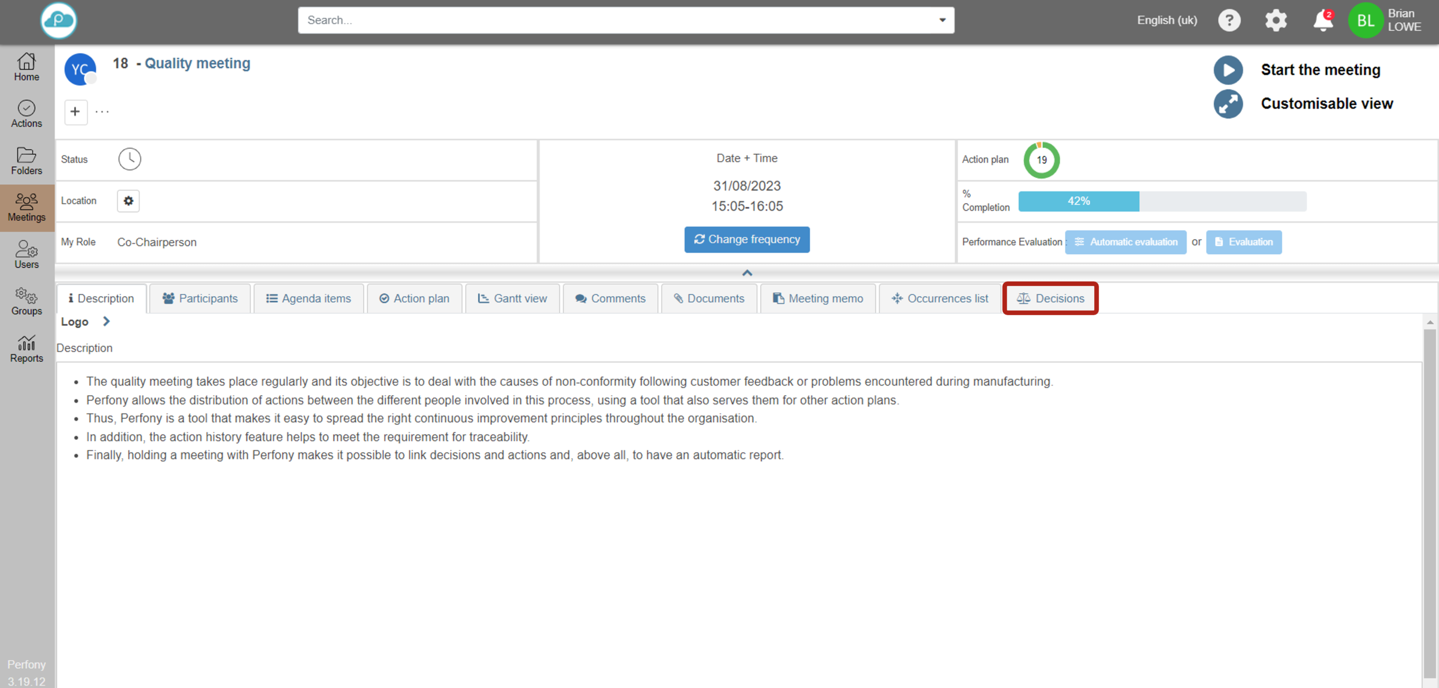 Afin de consulter une décision vous pouvez vous rendre dans l’une de vos réunions, en passant par l’onglet réunion du menu, puis en cliquant sur l’une de vos réunions pour l’ouvrir.
