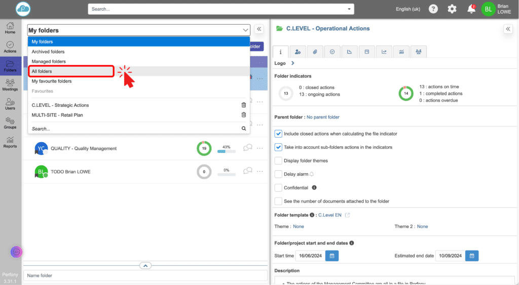 Une fois les droits activés par Perfony, le Super Administrateur recevra un email de confirmation. Il pourra alors visualiser tous les dossiers du compte en accédant au menu « Dossiers » et en sélectionnant « tous les dossiers » dans le menu déroulant.