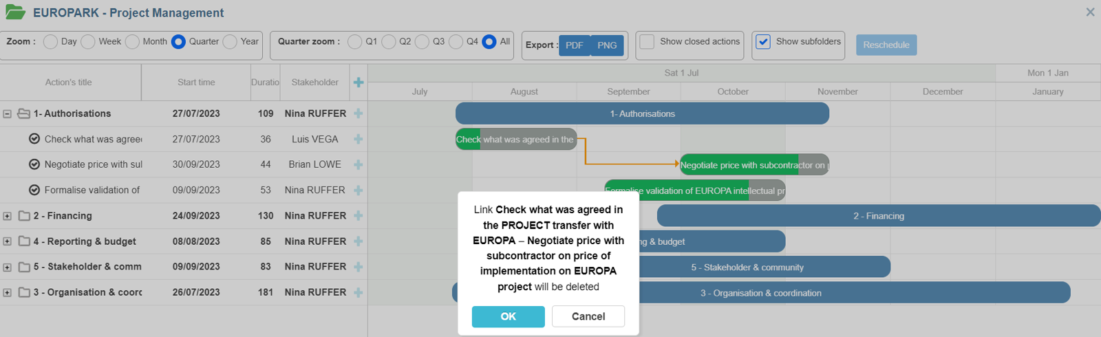 Depuis la vue Gantt, il vous est possible de lier et délier des actions entre elles très simplement.