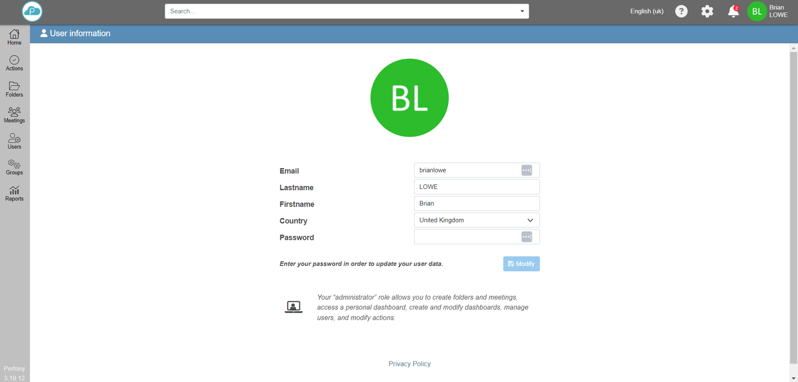 Vous arrivez ensuite sur la page d’informations utilisateur, où vous pouvez modifier votre adresse email, votre nom et prénom d’utilisateur, le pays ainsi que votre mot de passe.