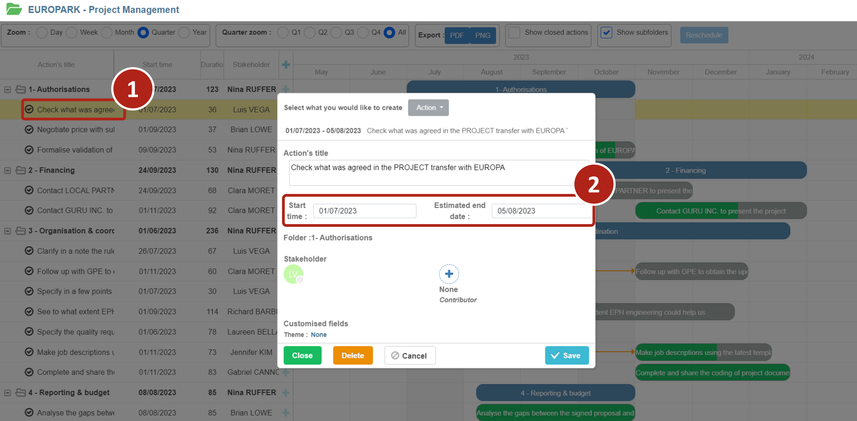 Double cliquez sur une action afin qu’une fenêtre de configuration s’ouvre. Ainsi vous pourrez modifier la date de début et la date d’échéance de l’action.