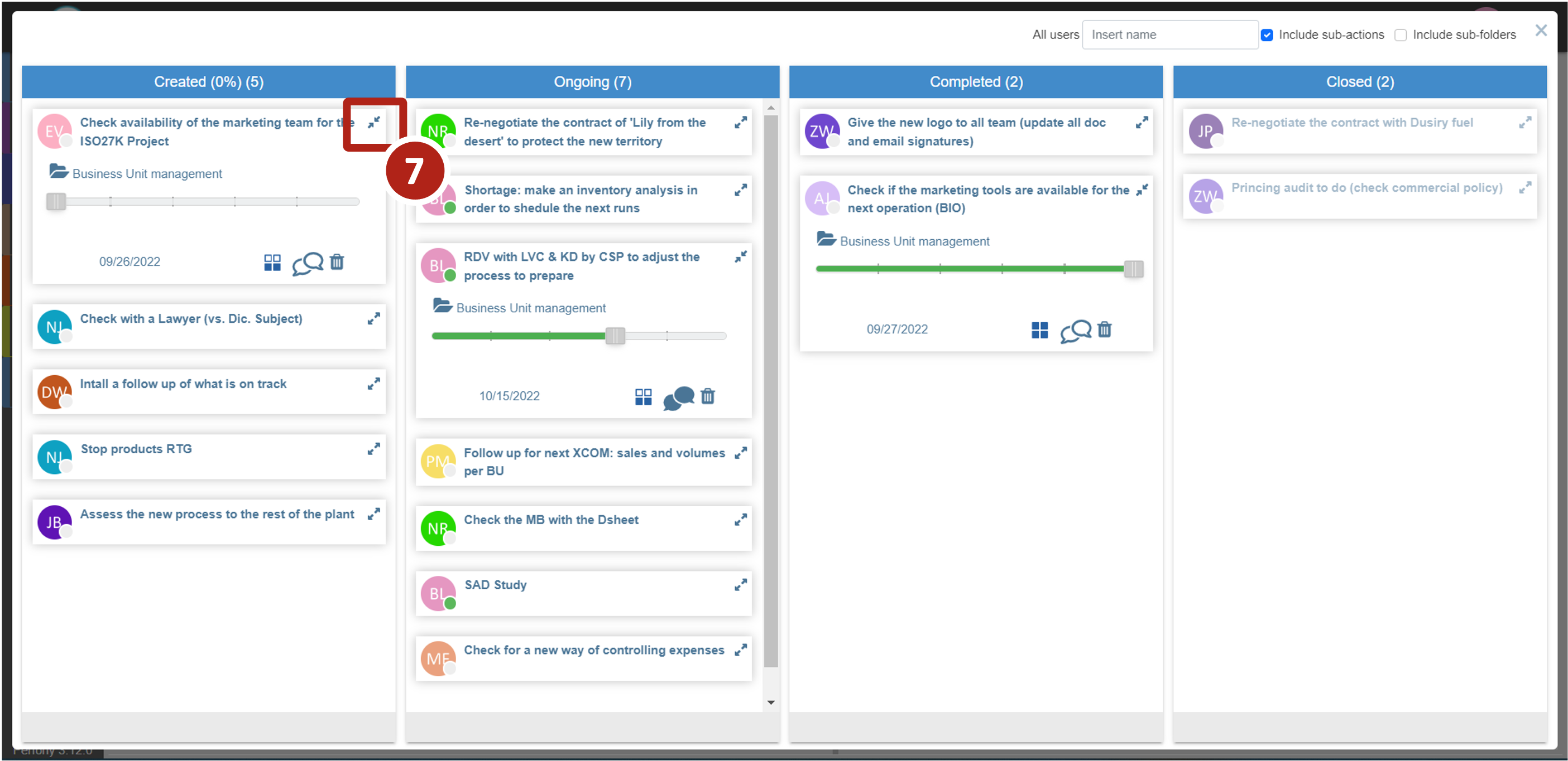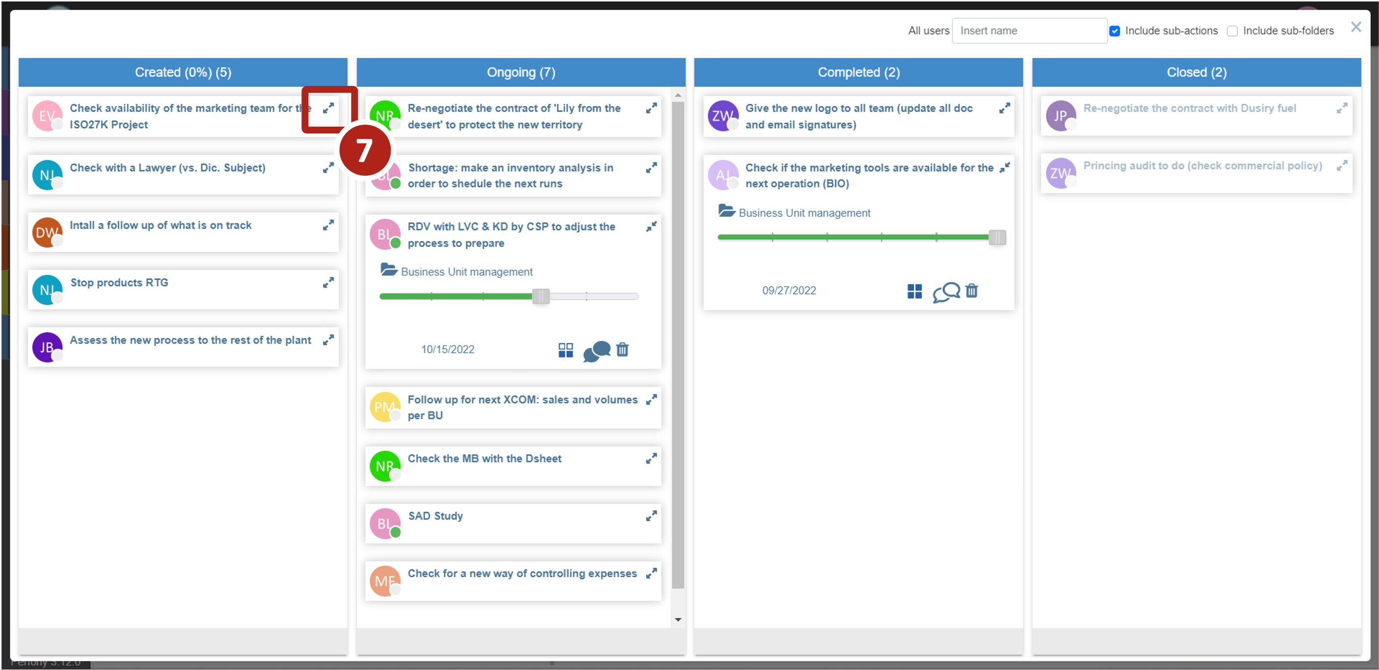 Depuis l’onglet Kanban de votre dossier , cliquez sur l’icône d’extension pour passer en dans une vue étendue qui occupera pour la page de votre navigateur.