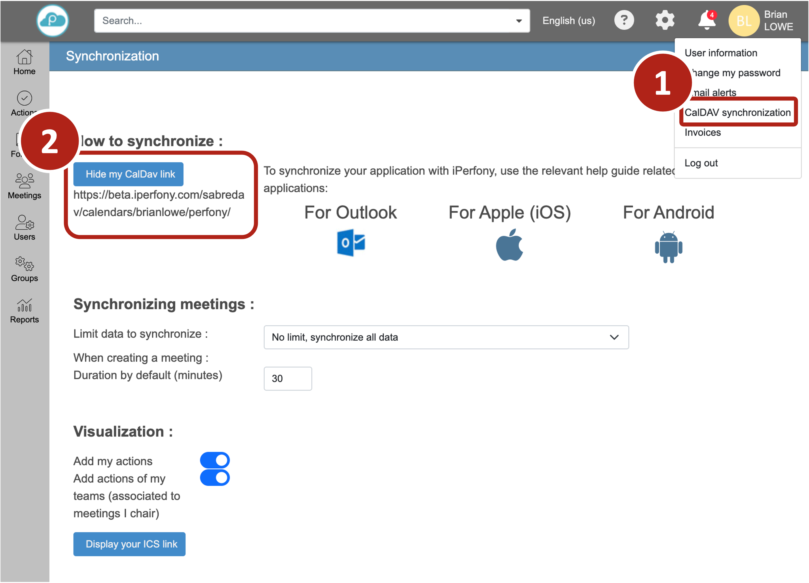 1/ Au préalable, rendez-vous dans votre espace iPerfony, cliquez sur votre avatar et choisissez le menu « Synchronisation CalDAV » .