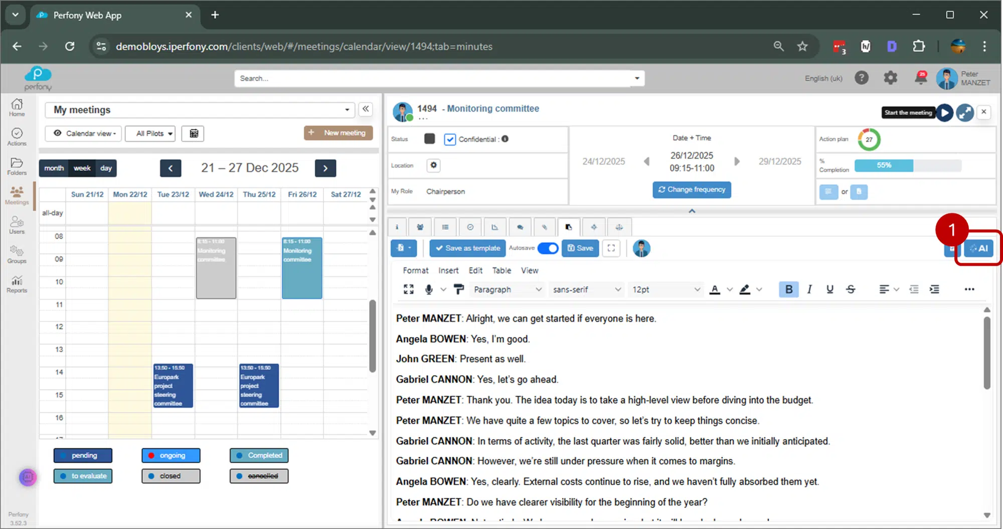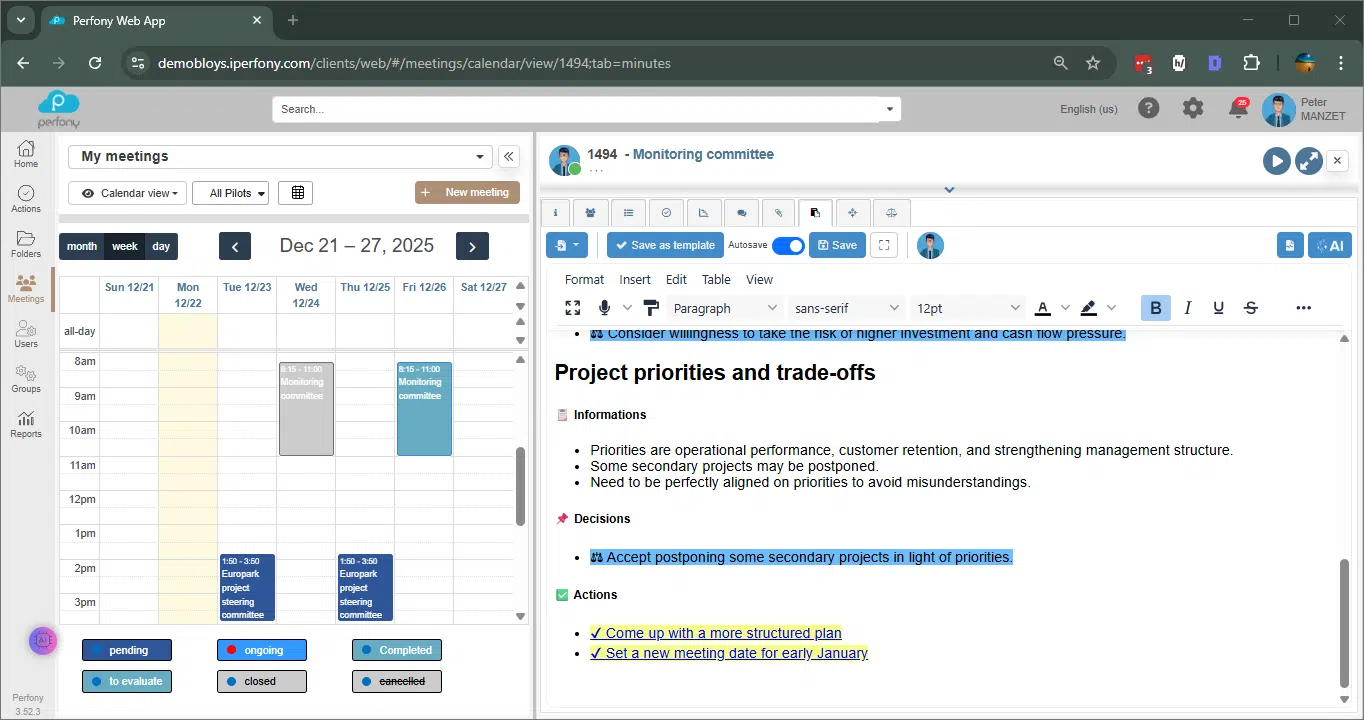 Pour aller plus loin, consultez les articles dédiés à la retranscription dans Perfony, ou à l’exploitation des décisions et des actions identifiées, qui détaillent son paramétrage et son utilisation dans vos comptes‑rendus de réunion.