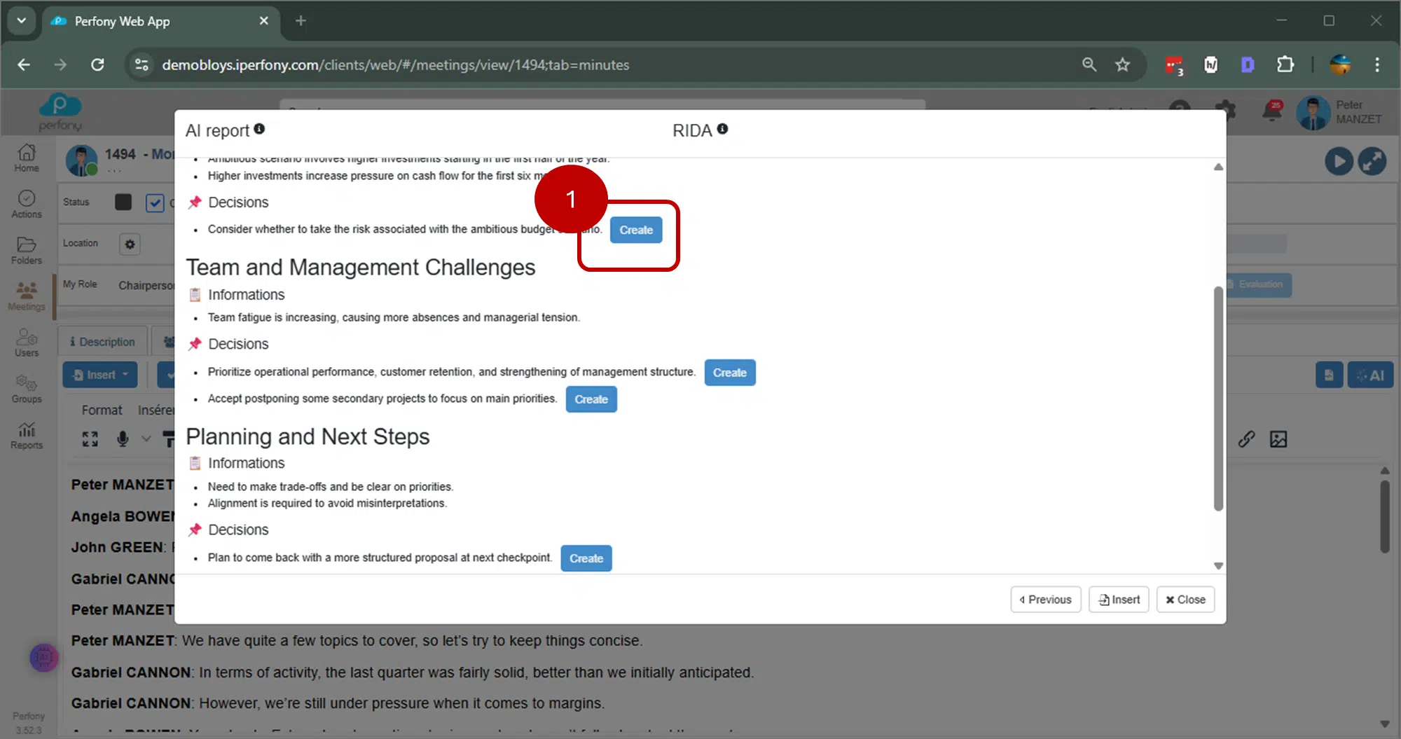 À l’exception du modèle « Synthèse uniquement », les trois autres formats de synthèse offrent la possibilité, pour chaque action ou décision identifiée, de créer directement l’élément correspondant dans Perfony, facilitant ainsi le suivi opérationnel après la réunion.