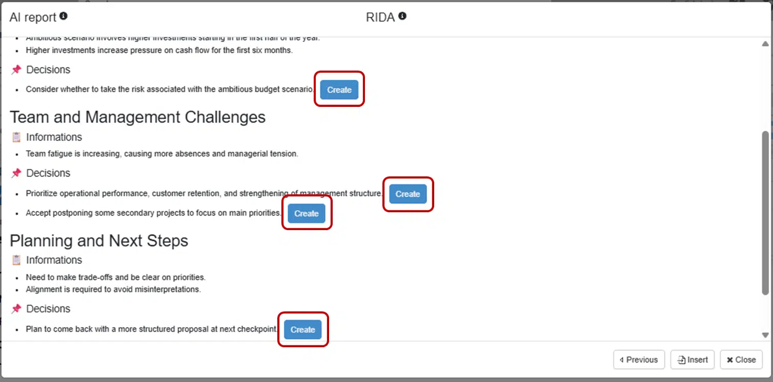 - RIDA – Informations, actions et décisions : Identification de toutes les informations utiles, ainsi que des actions et/ou décisions qui en découlent.