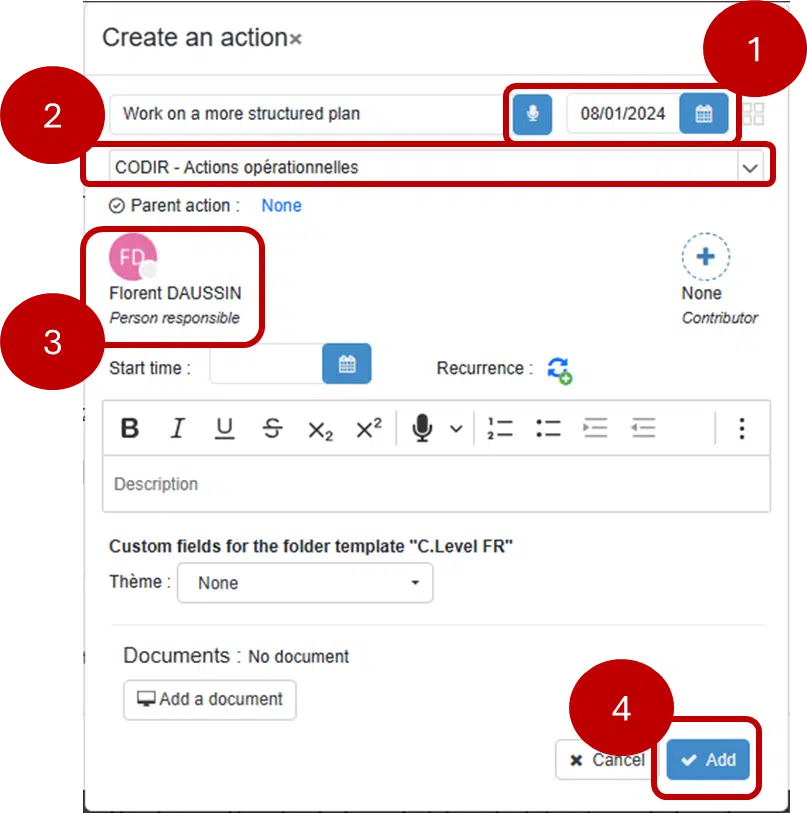 2. Cliquez sur « Ajouter » pour créer l’action (4), ou sur « Annuler » pour ne rien faire. Dans le premier cas, l’action est ajoutée au plan d’action et mise en évidence dans le compte-rendu (soulignement).