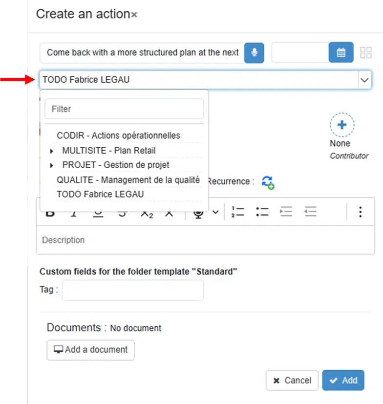 Dossier d’origine (2) Vérifiez que l’action soit bien créée dans le dossier souhaité. Pour modifier l’origine, cliquez sur le nom du dossier et sélectionnez un autre dossier.