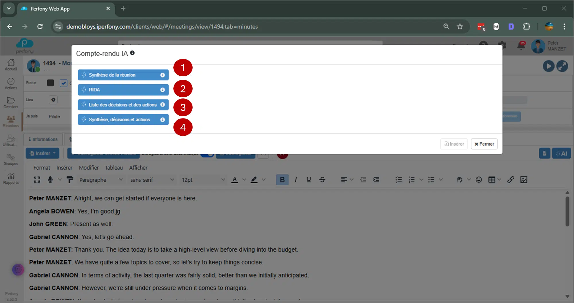 Au moment de fermer la fenêtre, l’ensemble du texte sera inséré dans le compte-rendu. Les actions ou décisions seront inscrites dans le CR, mais ne seront pas créées dans Perfony.