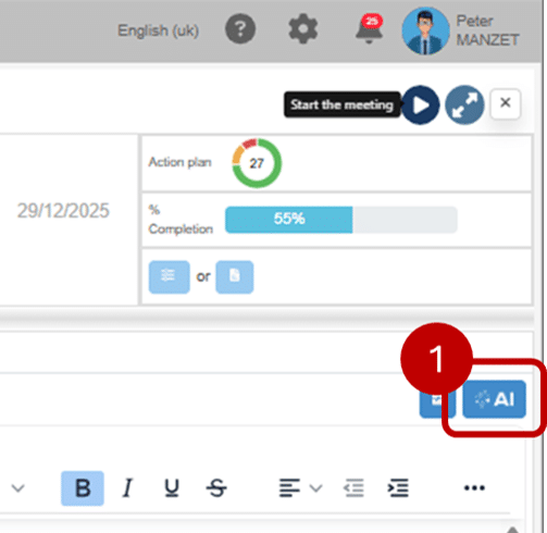 Note : l’icône IA n’est plus disponible lorsque la réunion passe au statut Clôturée.