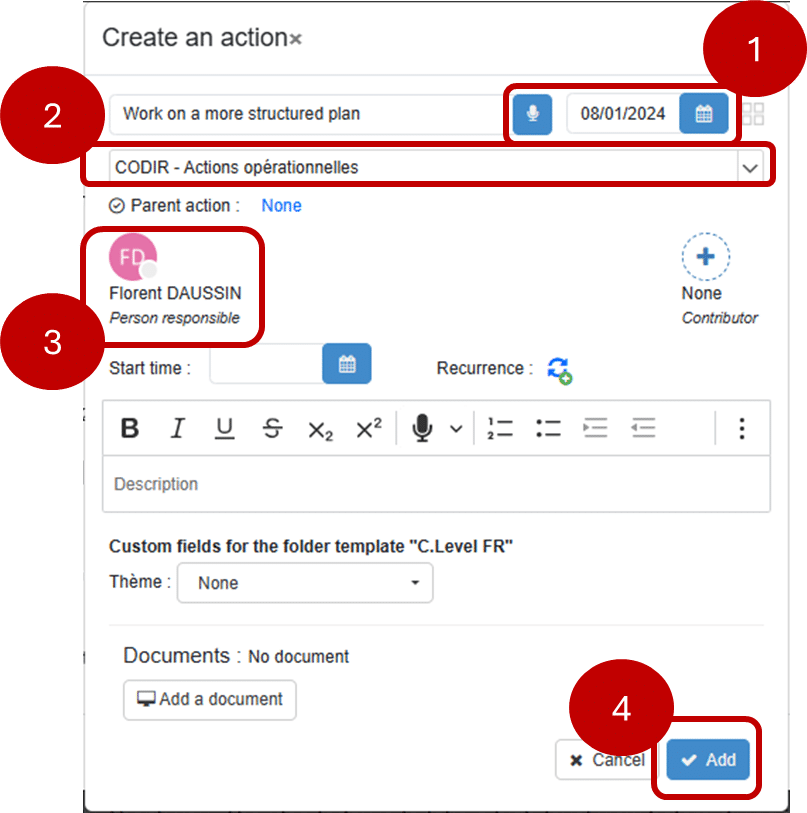 2. Cliquez sur « Ajouter » pour créer l’action (4), ou sur « Annuler » pour ne rien faire. Dans le premier cas, l’action est ajoutée au plan d’action et mise en évidence dans le compte-rendu (soulignement).