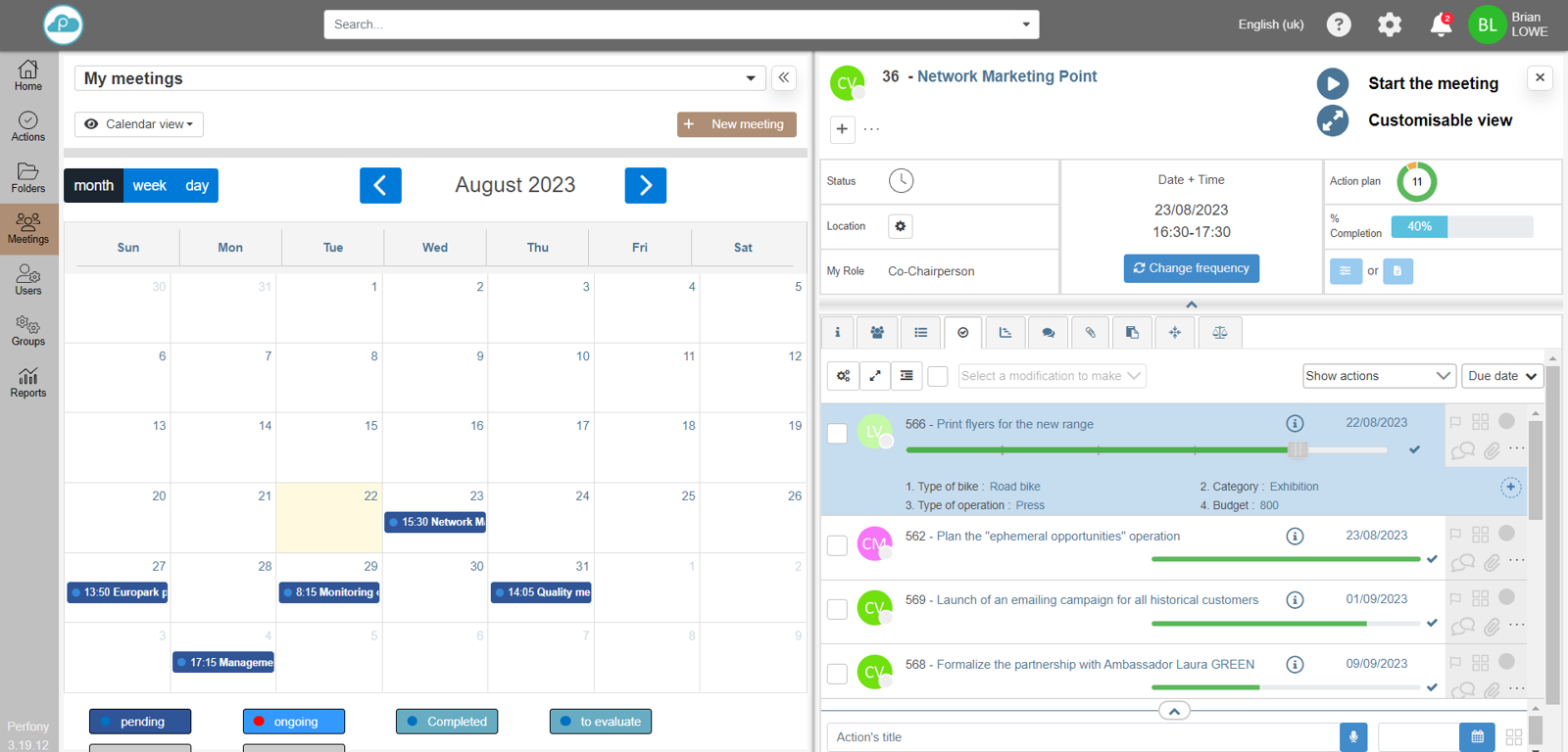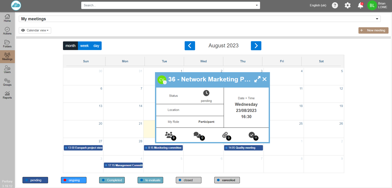 Pour afficher vos réunions en vue calendrier, rendez-vous dans le menu principal « réunion » et utilisez le menu déroulant pour choisir « vue calendrier ».