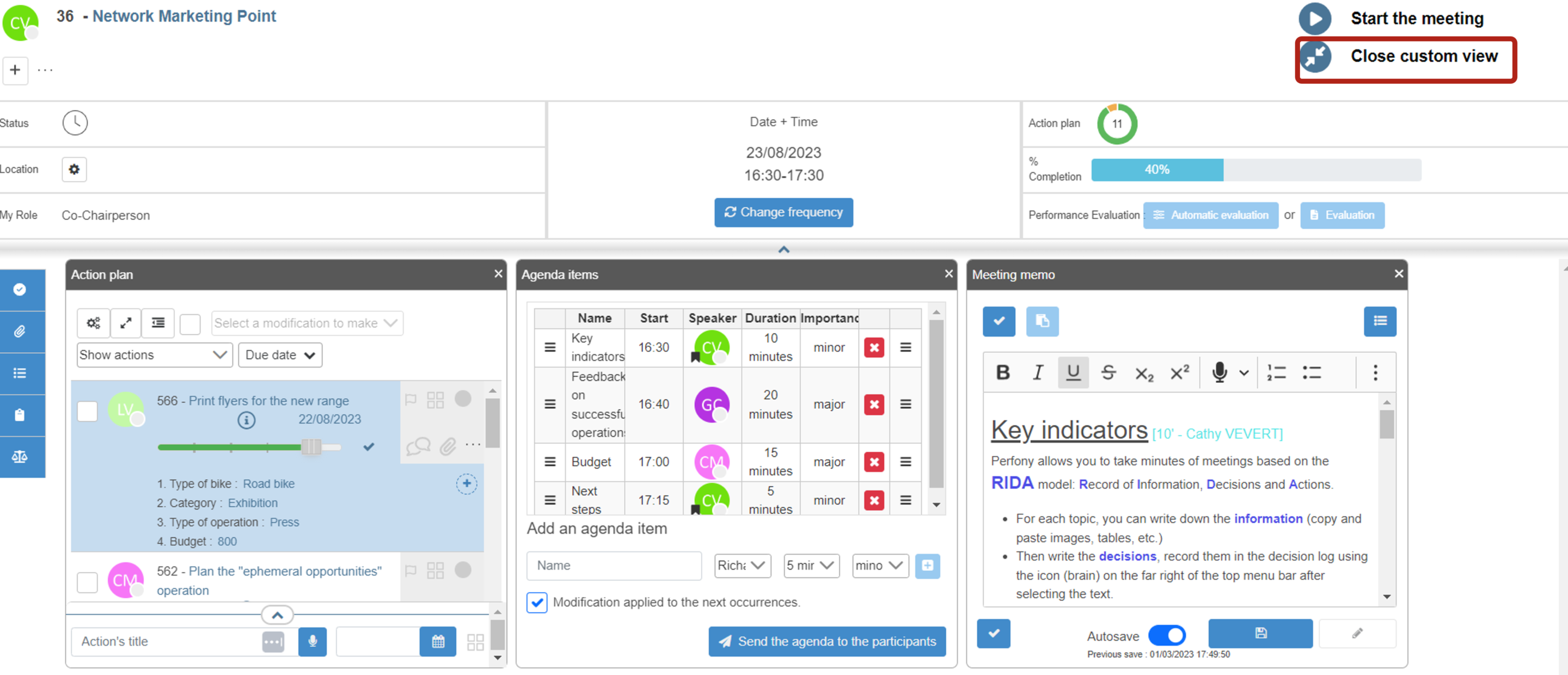 Ouvrez une de vos réunions, puis cliquez sur l’icône « vue personnalisable » pour modifier la façon dont vous sont présentés les éléments.