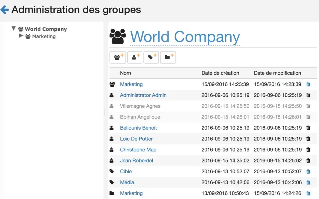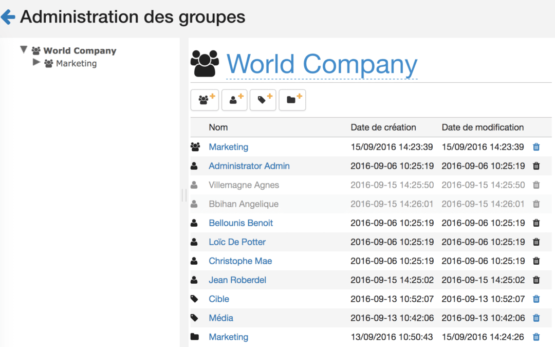 Ces groupes pourront avoir accès à des paramétrages particuliers, comme par exemple des thèmes qui leur seront propres : un service marketing n’a pas l’utilité des thèmes des RH par exemple.