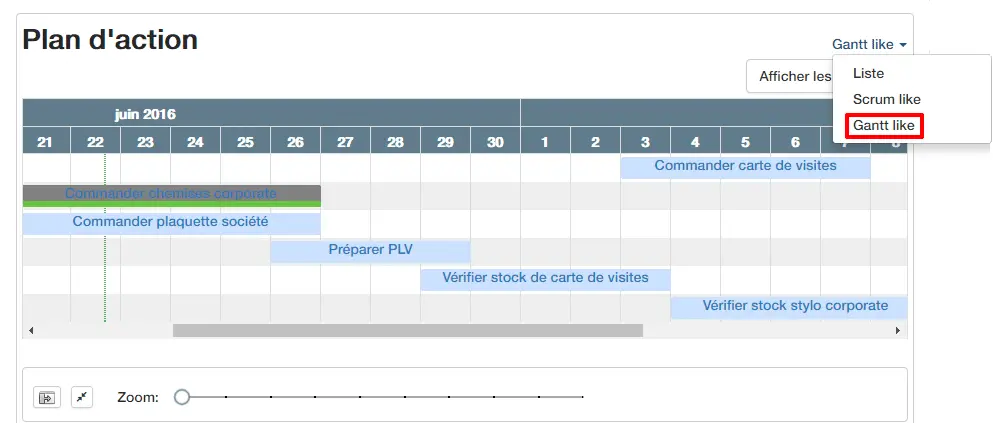 Après la vue de vos plans d’action par liste et la vue « Scrum », vous aurez la possibilité d’afficher vos dossiers sous la forme d’une vue « Gantt ». Déplacez vos actions, mettez-les à jour grâce à un simple cliqué-glissé.