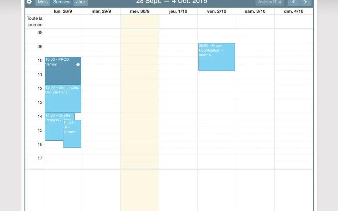 En dehors des améliorations esthétiques, vous découvrirez une présentation des réunions sous forme de calendrier. Les réunions peuvent être de 2 couleurs : bleu foncé lorsque vous en êtes le pilote, et bleu clair pour les autres.