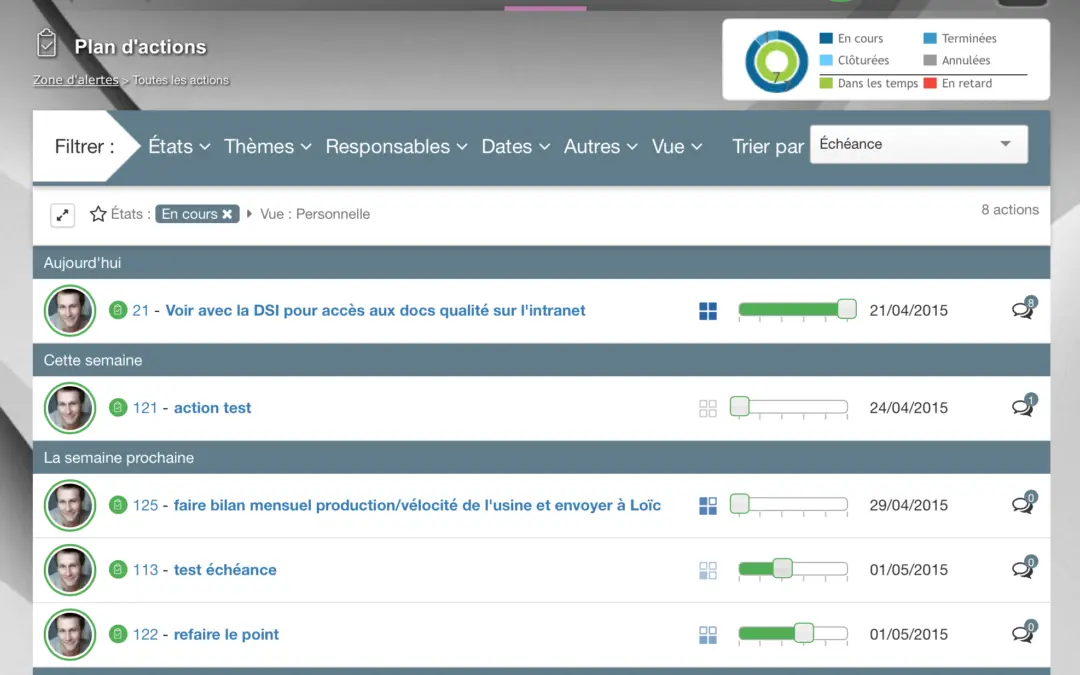 - une meilleure compréhension de votre activité grâce à des indicateurs clairs : actions en retard, en cours, terminées…,