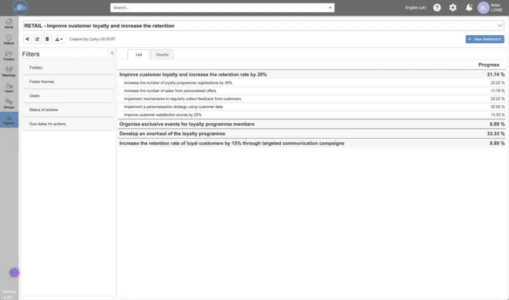 I vostri OKR in Perfony saranno disponibili e aggiornati automaticamente sotto forma di elenchi e grafici.