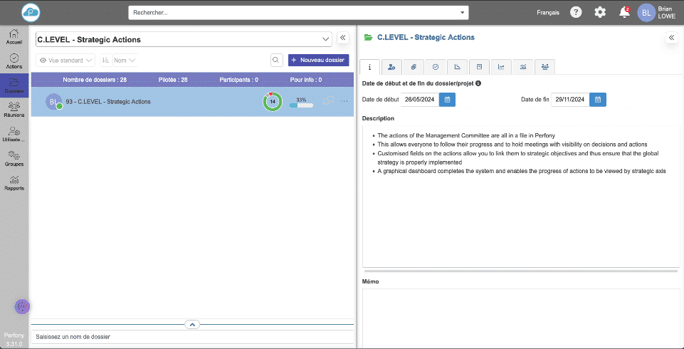 Infine, due campi a testo libero completano la pagina delle informazioni sulla cartella: “descrizione” e “memo“.”Si può usare il primo per inserire dati fissi relativi alla pratica (ad esempio, le regole di gestione della pratica, chi ha il diritto di intraprendere un’azione, come collaborare alle azioni) e il secondo (memo) può essere usato per prendere appunti man mano che si procede nella vita della pratica. Questo può sostituire il modulo “riunione” se non si ha bisogno della formalità di una riunione.