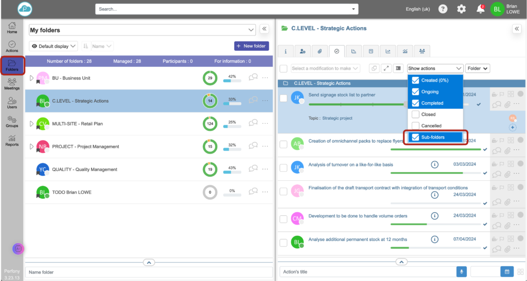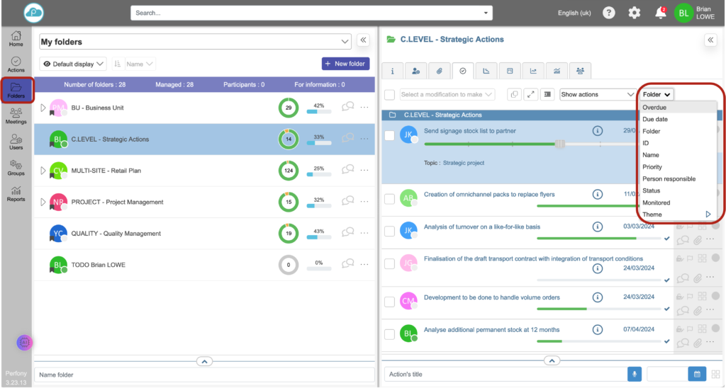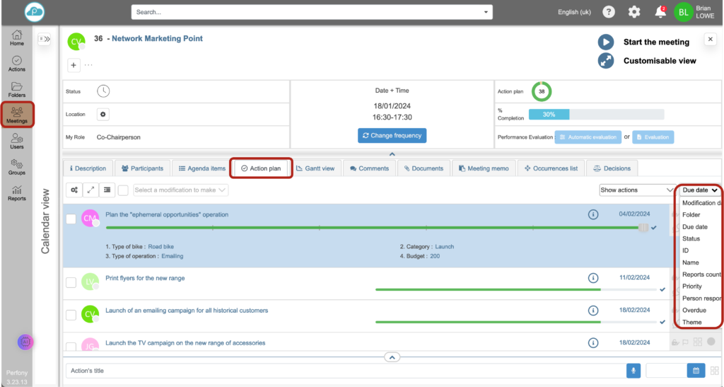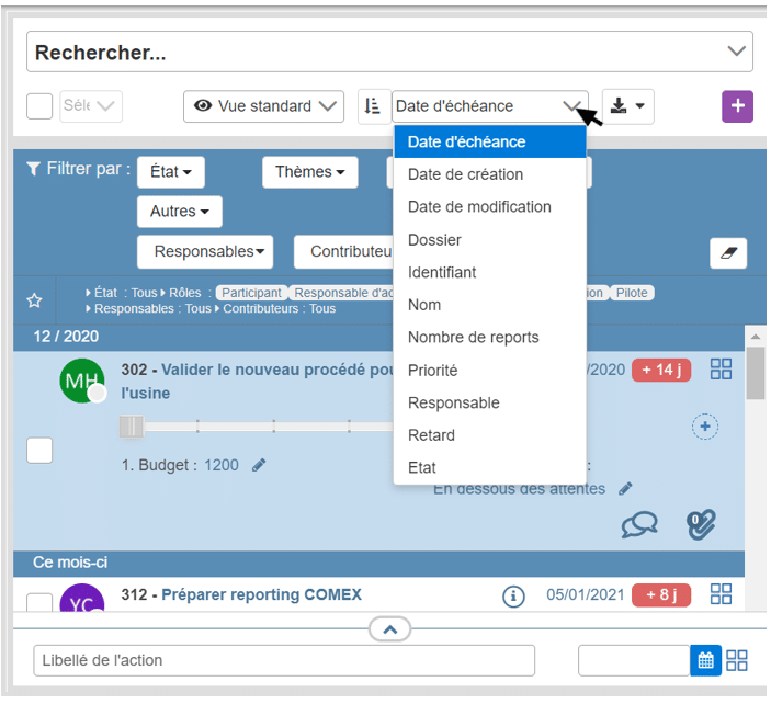 Dal menu “Azioni”, “Cartelle” o “Riunioni”, è possibile ordinare le azioni in base a diversi criteri per semplificare il monitoraggio.