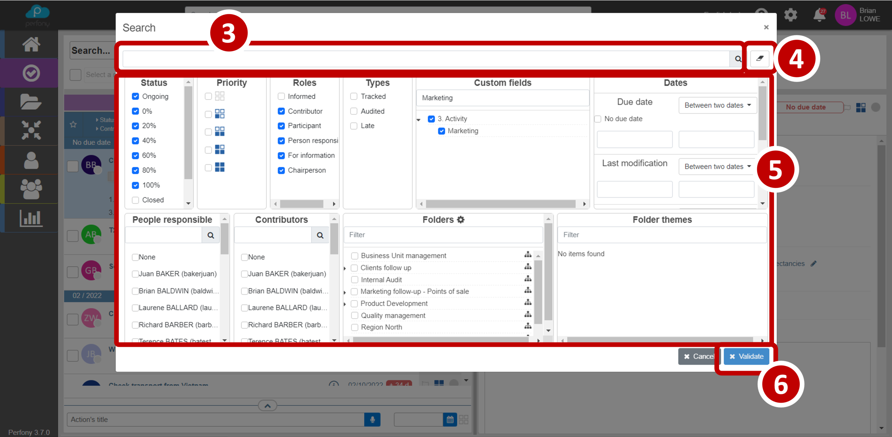 Nel vostro spazio di lavoro Perfony, scegliete il menu “azioni” , aprite il menu a tendina per selezionare “Cerca” (.