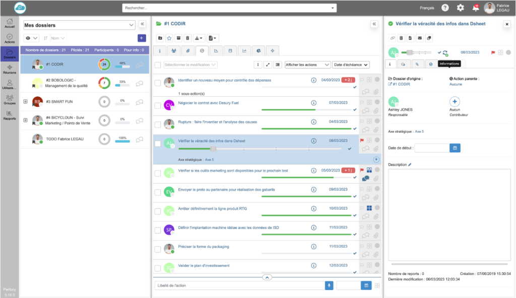 Molte pagine dell’area di lavoro Perfony sono composte da 2 riquadri: uno a sinistra con gli elenchi (elenco delle azioni, elenco delle riunioni, elenco degli utenti, ecc…) e l’altro a destra per visualizzare i dettagli di un elemento selezionato nel riquadro di sinistra.