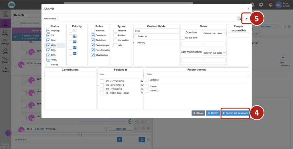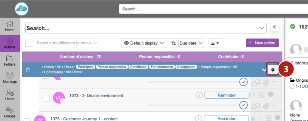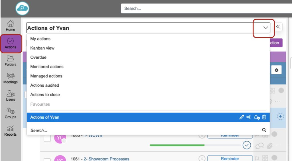 Een actieweergave wordt gemaakt met behulp van de geavanceerde zoekmodule, die toegankelijk is via het menu “Acties” [] en klik vervolgens onderaan het vervolgkeuzemenu op “Zoeken” [] .