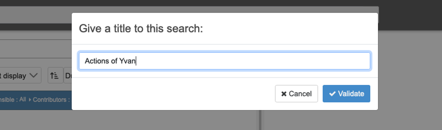 Zodra je op “zoeken en bookmarken” hebt geklikt, wordt er een pop-upvenster geopend waarin je wordt gevraagd onder welke naam je deze lijst wilt opslaan. Voer een naam in, valideer en deze lijst wordt automatisch weergegeven in de lijst met weergaven en kan op elk moment worden teruggevonden in het vervolgkeuzemenu van het menu “Acties”.
