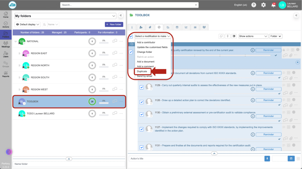 Tip: Voor identieke acties die in meerdere mappen moeten worden gedupliceerd en waarvoor je de algemene voortgang wilt controleren, is het een goed idee om een “map” of “toolbox” map te maken waarin je je standaardacties kunt maken. Kopieer ze vervolgens door erop te klikken in de gewenste mappen. Dit zorgt ervoor dat de juiste acties op de juiste plaatsen in de kortst mogelijke tijd worden gedupliceerd.